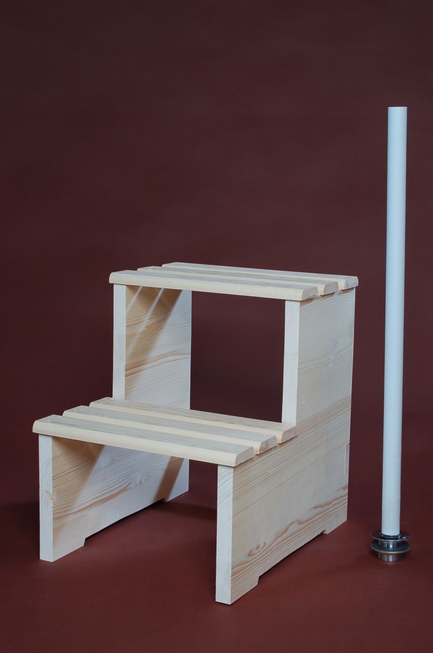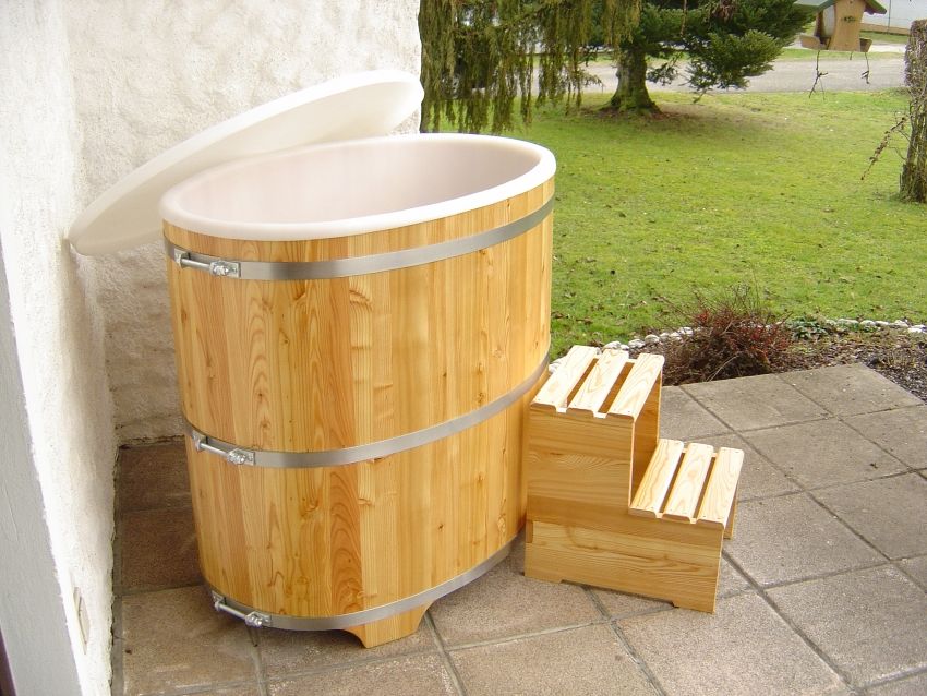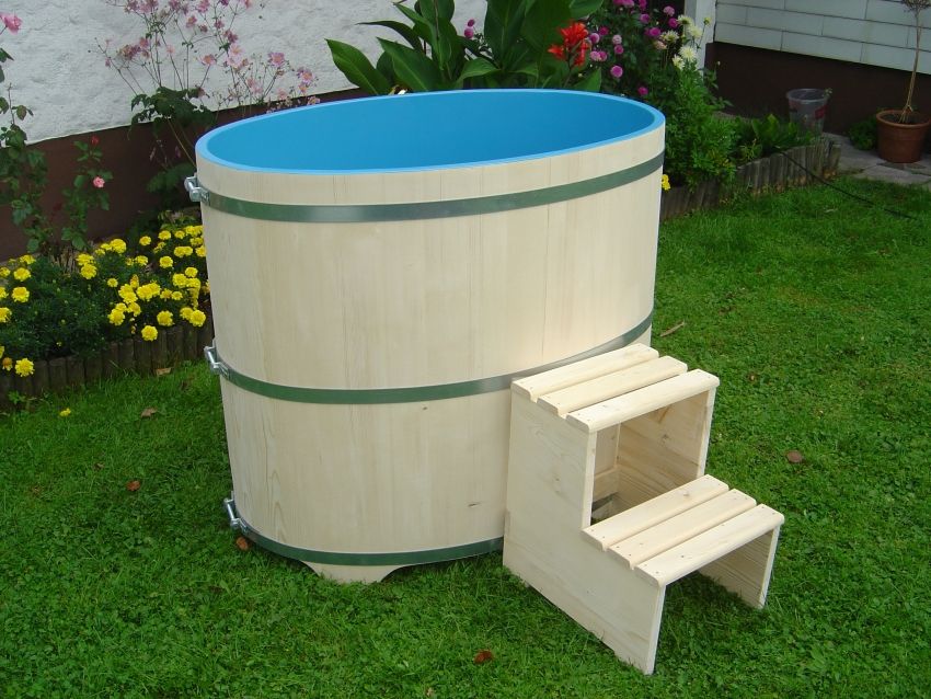 Lärchenholz, außen farblos beschichtet, mit Kunststoffeinsatz und Abschlussdeckel aus Kunststoff, drei nachspannbare Edelstahlreifen, Innentrittstufe, Außentreppe, Ablaufventil 1 ¼ Zoll, Kunststoff-Überlaufstandrohr,