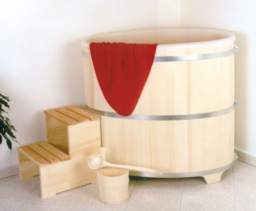 Fichtenholz, außen natur, mit Kunststoffeinsatz, drei verzinkte nachspannbare Bandstahlreifen, Innentrittstufe, Außentreppe, Ablaufventil 1 ¼ Zoll, Kunststoff-Überlaufstandrohr