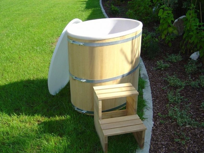 Lärchenholz, außen natur, mit Kunststoffeinsatz und Abschlussdeckel aus Kunststoff, drei verzinkte nachspannbare Bandstahlreifen, Innentrittstufe, Außentreppe, Ablaufventil 1 ¼ Zoll, Kunststoff-Überlaufstandrohr